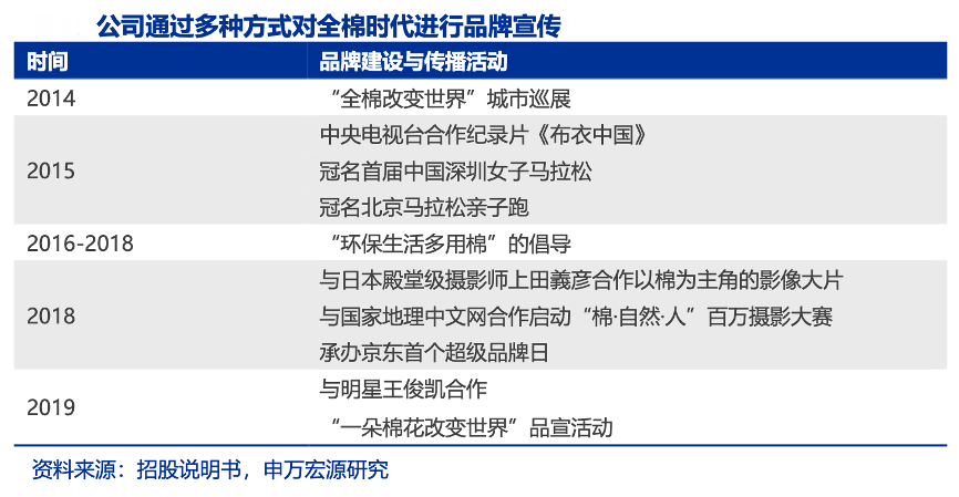 經(jīng)典案例:根據(jù)招股說明書、申萬宏源研究等綜合資訊表明,全棉時代以“醫(yī)學(xué)貼近生活、全棉呵護健康”為品牌主張,主打“舒適,健康,環(huán)保”理念,針對不同生活場景推出以棉替代化纖的產(chǎn)品,通過品牌巡展、明星代言、賽事贊助等多種方式進行品牌宣傳,知名度不斷提升。2015 年,全棉時代獨家冠名首屆中國深圳女子馬拉松、冠名北京馬拉松親子跑,針對性提升品牌在女性、親子兩類核心客群中知名度。2019 年,全棉時代榮獲由CCTV 主辦的“新中國成立 70 周年 70 品牌”之譽。