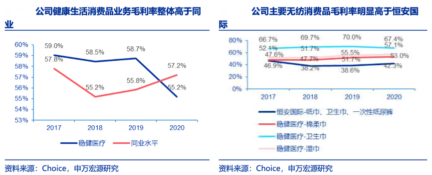 經(jīng)典案例:根據(jù)choice、申萬宏源研究等綜合資訊表明,2020年穩(wěn)健醫(yī)療公司棉柔巾(53.0%)、衛(wèi)生巾(67.4%)、濕巾(57.1%)毛 利率均明顯高于可比公司恒安國際(42.3%)。公司優(yōu)勢包括:a)全產(chǎn)業(yè)鏈優(yōu)勢。不同于恒安國際需要向上游采購無紡布,公司可以自主生產(chǎn)棉柔巾、衛(wèi)生巾的主要原材料無紡布; b)附加值優(yōu)勢。其產(chǎn)品依托全棉水刺無紡布技術(shù),具有議價能力,附加值相對更高。