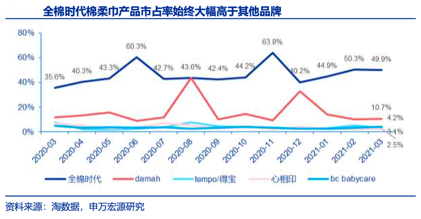 經(jīng)典案例:根據(jù)淘數(shù)據(jù)、申萬宏源研究等綜合資訊表明,以明星產(chǎn)品棉柔巾為例:2020年3月至2021年3月,淘寶全網(wǎng)棉柔巾/洗臉巾銷 售額排名前五的品牌分別為全棉時代、damah、得寶、心相印、bc babycare。其中,全棉時代棉柔巾成交金額5.6億元,市場份額50.1%,斷層式超越其他品牌,具有絕對龍頭的市場地位。