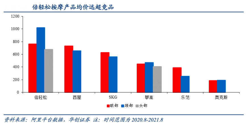 經(jīng)典案例:根據(jù)阿里平臺(tái)數(shù)據(jù)、華創(chuàng)證券等綜合資訊表明,倍輕松公司基于較強(qiáng)技術(shù)創(chuàng)新能力,核心產(chǎn)品多采用優(yōu)勢的物理機(jī)械式仿人手按摩,將傳統(tǒng)中醫(yī)按摩與現(xiàn)代科技相融合,使用效果與科技含量較競品更具優(yōu)勢,也由此獲得更高溢價(jià)。其產(chǎn)品定位高端,眼部/頸部/頭部按摩器線上均價(jià)分別為 762.7/1018.3/675.7 元,各品類均價(jià)引領(lǐng)其他主要品牌,較同賽道價(jià)格次位品牌分別高出 4.6%/56.1%/67.2%以上。