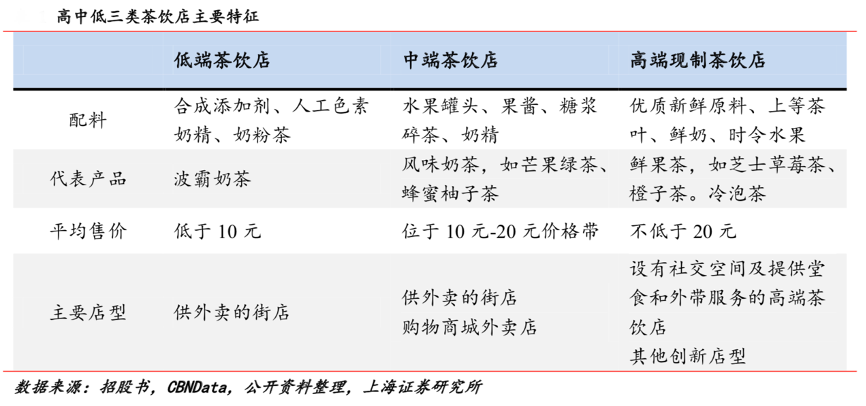 經(jīng)典案例:根據(jù)招股書、CBNData、公開資料整理、上海證券研究所等綜合資訊表明,以平均售價劃分,現(xiàn)制茶飲店可分為三類:高端店(平均售價 不低于 20 元)、中端店(10 元-20 元)、低端店(低于 10 元)。高端茶飲店以優(yōu)質茶葉代替茶粉、以新鮮水果代替糖漿、以進口奶油代替奶精,同時注重場景設置和門店的空間體驗,致力于為顧客提供一個集社交與休閑屬性于一體的場所。