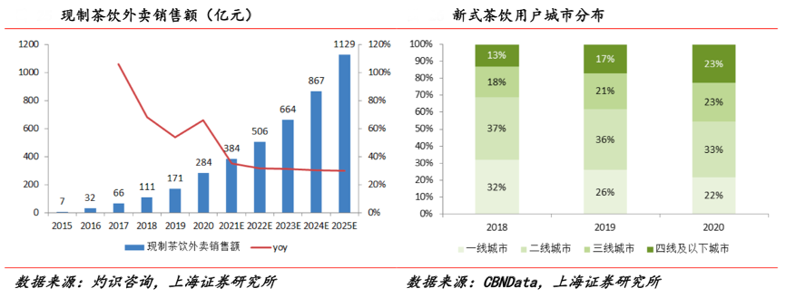 經(jīng)典案例:根據(jù)灼識咨詢、CBNData、上海證券研究所等綜合資訊表明,從市場下沉來看,2020年新式茶飲在一線、二線、三線、四線及以下城市市場增速分別為40.53%、52.24%、81.9%、124.7%,三線以下城市新式茶飲市場有很大的增長空間。目前現(xiàn)制茶飲門店多位于一二城市,而三四線城鎮(zhèn)青年群體消費意愿強烈,其將呈現(xiàn)向三四線城市下沉趨勢。