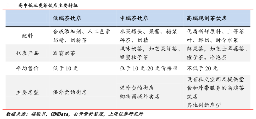 經(jīng)典案例:根據(jù)招股書、CBNData、公開資料整理、上海證券研究所等綜合資訊表明,近年來隨著對新式茶飲體驗的需求不斷增長,顧客更愿意為提升消費體驗支付更多的費用,因此涌現(xiàn)了大批高端的現(xiàn)制茶飲點店。以平均售價劃分,現(xiàn)制茶飲店可分為三類:高端店(平均售價不低于 20 元)、中端店(10元-20 元)、低端店(低于10元)。高端茶飲店以優(yōu)質茶葉代替茶粉、以新鮮水果代替糖漿、以進口奶油代替奶精,同時注重場景設置和門店的空間體驗,致力于為顧客提供一個集社交與休閑屬性于一體的場所。