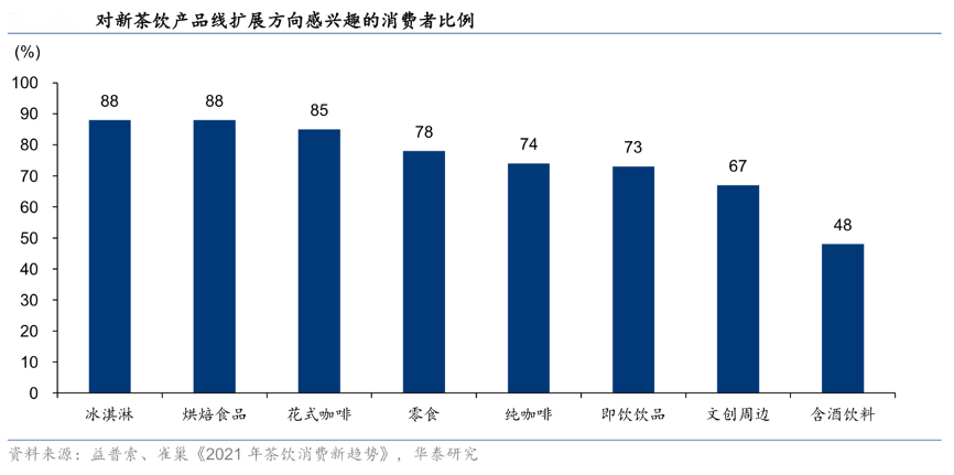 經(jīng)典案例:根據(jù)益普索雀巢聯(lián)合發(fā)布的《2021年茶飲消費(fèi)新趨勢》、華泰研究等綜合資訊表明,新茶飲領(lǐng)先品牌產(chǎn)品類別已拓展至茶飲外的品類,包括冰淇淋、烘焙食品、花式咖啡、零售、即飲飲品等,甚至拓展到文創(chuàng)周邊等非餐飲品類。據(jù)益普索、雀巢聯(lián)合發(fā)布的《2021 年 茶飲消費(fèi)新趨勢》,分別有 88%、88%、85%的消費(fèi)者對新茶飲品牌推出的冰淇淋、烘焙食品、花式咖啡感興趣。