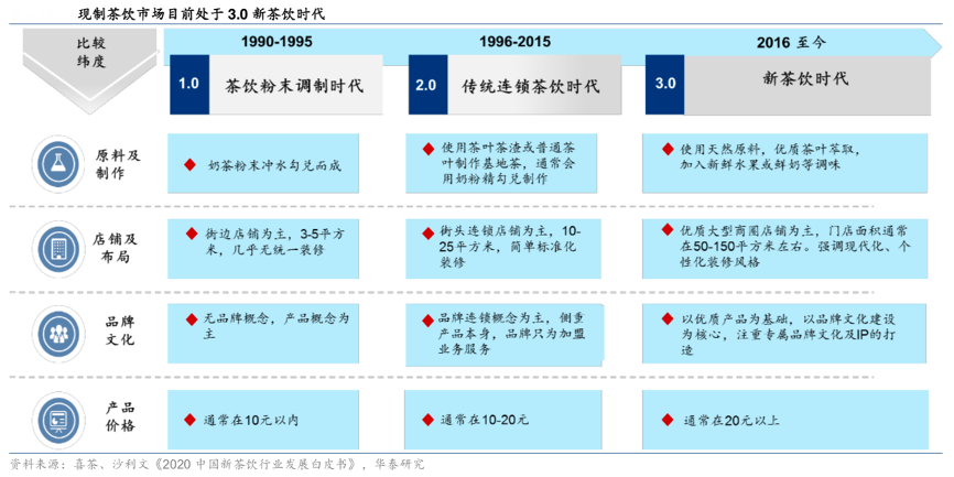 經(jīng)典案例:根據(jù)喜茶沙利文《2020年中國新茶飲行業(yè)發(fā)展白皮書》、華泰研究等綜合資訊表明,中國現(xiàn)制茶飲行業(yè)發(fā)展共經(jīng)歷三個(gè)階段:1990-1995 年的茶飲粉末調(diào)制時(shí)代(由售價(jià)通常在人民幣 10 元以內(nèi)定位低端的粉末調(diào)制茶飲主導(dǎo)),1996-2015 年的傳統(tǒng)連鎖茶飲時(shí)代(由售價(jià)通常在人民幣 10-20 元定位中端的傳統(tǒng)連鎖茶飲主導(dǎo)),以及2016 年至今的新茶飲時(shí)代(由售價(jià)通常在人民幣 20 元以上的定位高端的新式茶飲主導(dǎo))。