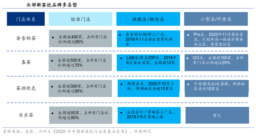 經(jīng)典案例:根據(jù)喜茶沙利文《2020年中國新茶飲行業(yè)發(fā)展白皮書》、華泰研究等綜合資訊表明,新式茶飲針對不同消費(fèi)場景,設(shè)計(jì)了不同類型的門店,包括標(biāo)準(zhǔn)店、主題店、快閃 店、特色店等。差異化的店型,一方面能夠更好滿足消費(fèi)者多元化的需求,另一方面也能 夠兼容更多的物業(yè)場景,包括購物中心、寫字樓、居民區(qū)、交通中心等。