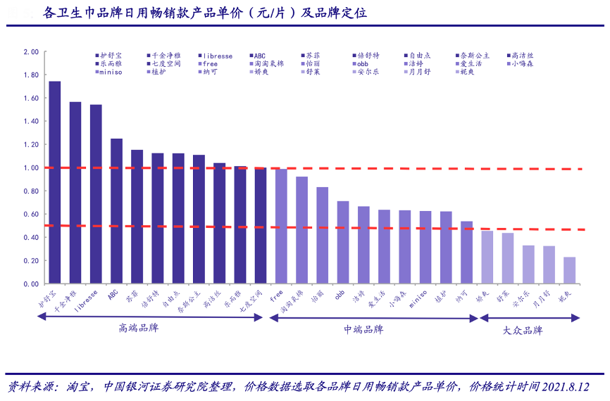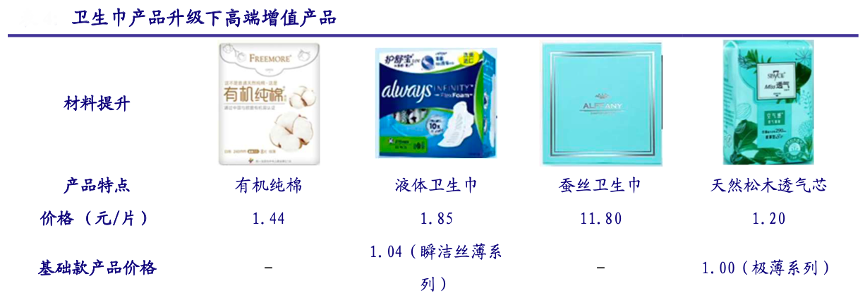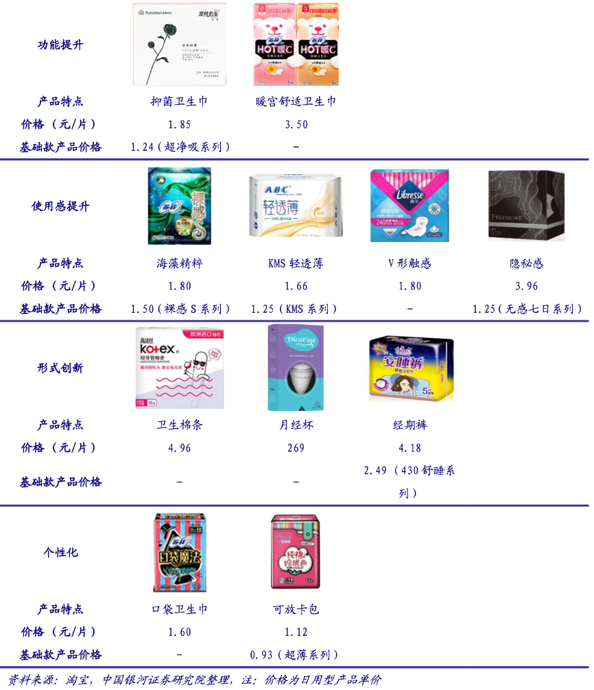 經(jīng)典案例:根據(jù)淘寶、中國銀河證券研究院等綜合資訊表明,衛(wèi)生巾市場產(chǎn)品的中高端化迭代進程正在進行,產(chǎn)品創(chuàng)新與升級不斷。如蘇菲針對中國市場消費者特點,推出了附帶有暖宮止痛功能的“hot 暖 C”系列衛(wèi)生巾,護舒寶推出首款液體衛(wèi)生巾,采用新型吸收材料,吸收性能出眾。這類產(chǎn)品在定價上普遍偏高,以日用型號衛(wèi)生巾為例,產(chǎn)品定價偏高,且明顯高于同品牌基礎款產(chǎn)品價格。