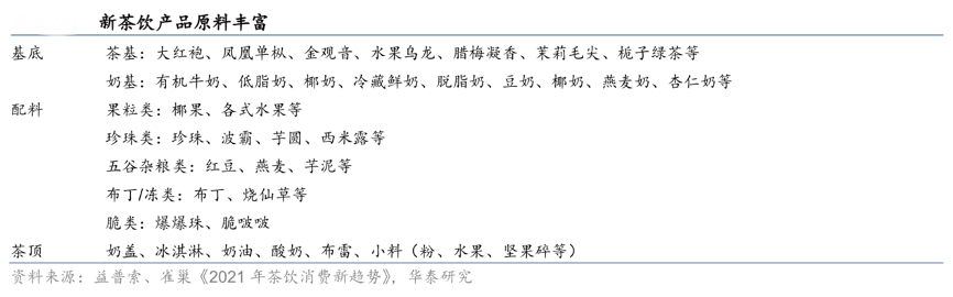 經(jīng)典案例:根據(jù)益普索雀巢《2021年茶飲消費(fèi)新趨勢》、華泰研究等綜合資訊表明,新茶飲產(chǎn)品構(gòu)成大致可分為三個(gè)層次,分別是基底(包括茶基/奶基)、配料(包括果粒類、珍珠類、五谷雜糧類、布丁/凍類、脆類)、茶頂(包括奶蓋、冰淇淋、酸奶、奶油以及各式的頂部小料如粉類、水果類、顆粒類)?;趯οM(fèi)者洞察,新茶飲品牌通過對產(chǎn)品結(jié)構(gòu)的有機(jī)組合,不斷推出新產(chǎn)品滿足消費(fèi)者日漸多元的需求,此外消費(fèi)者還可根據(jù)自身喜好進(jìn)行產(chǎn)品選擇甜度、溫度、是否分裝等。目前新式茶飲共包括純茶、奶茶、水果茶、奶蓋茶、水果奶茶、氣泡茶等。