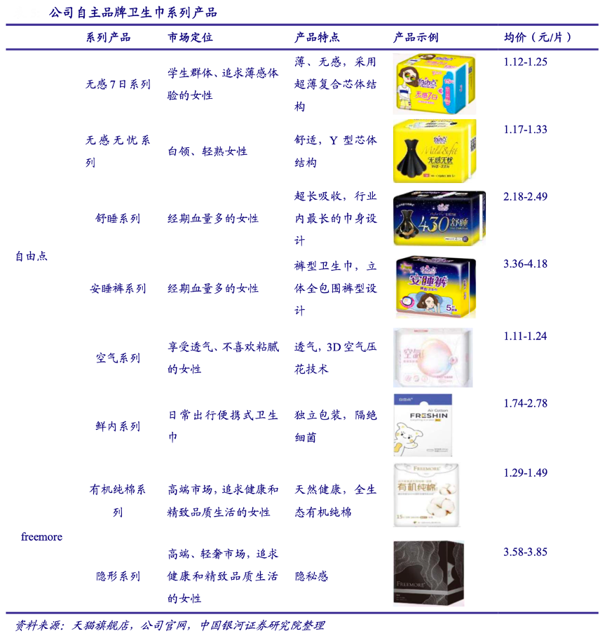 經(jīng)典案例:根據(jù)天貓旗艦店、公司官網(wǎng)、中國銀河證券研究院等綜合資訊表明,為順應(yīng)行業(yè)中高端化的消費趨勢,百亞股份公司推出定位中高端市場的衛(wèi)生巾品牌“自由點”,無感 7 日系列和無感無憂系列產(chǎn)品,分別適合學(xué)生群體和輕熟白領(lǐng)女性的日常需求,產(chǎn)品 具有輕薄、舒適的特點;公司重點推出的安睡褲系列產(chǎn)品,作為新型褲型衛(wèi)生巾,強化了防側(cè) 漏功能,提升了經(jīng)期血量較多的女性在睡眠時的舒適感。