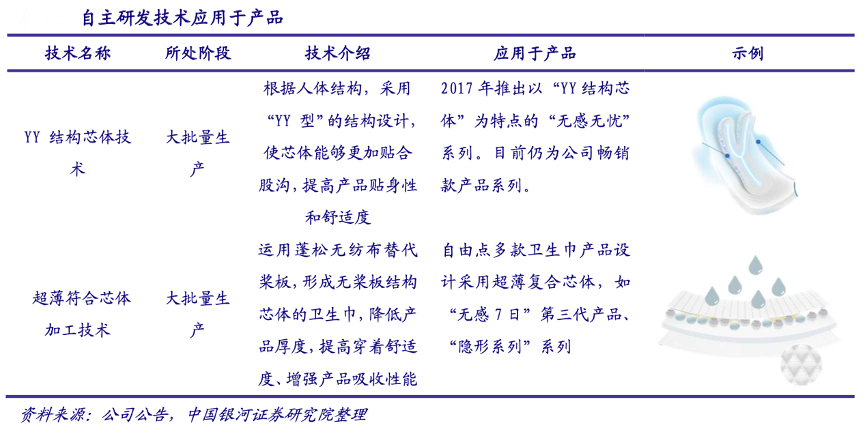 經(jīng)典案例:根據(jù)公司公告、中國銀河證券研究院等綜合資訊表明,百亞股份公司繼蘇菲之后第二個推出褲型衛(wèi)生巾,新推 出的無感七日系列第三代升級產(chǎn)品,厚度從 0.1cm 壓縮至 0.07cm,柔軟度增加 30%,進一步 提升產(chǎn)品的舒適性。過去 10 年,其推出了 10 余款系列新產(chǎn)品,新品迭代速度較快,能力強。自主研發(fā)技術(shù)廣泛應(yīng)用于產(chǎn)品。