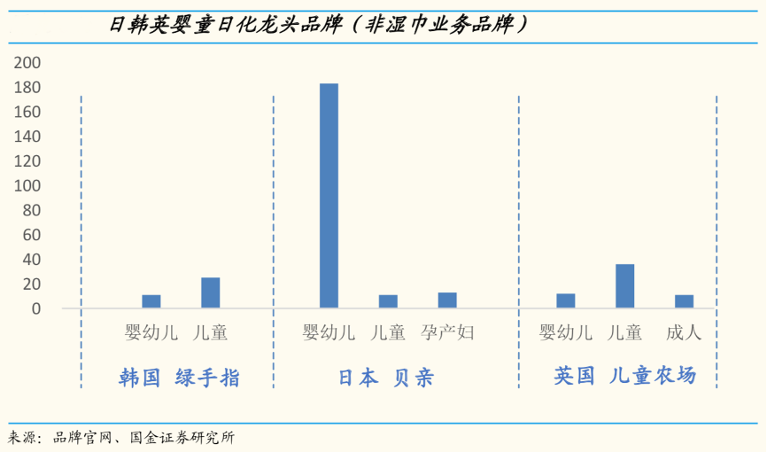 經(jīng)典案例:根據(jù)品牌官網(wǎng)、國金證券研究所等綜合資訊表明,英國頭部品牌兒童農(nóng)場在嬰幼童有機(jī)成分的品牌形象上、已推出成人線;韓國綠手指產(chǎn)品線深度覆蓋嬰幼兒及兒童日化領(lǐng)域全方位,有針對嬰幼兒的護(hù)膚及防曬、兒童高保濕系列及戶外系列;日本貝親以嬰幼兒為主,SKU較多,此外還有少量的兒童、孕產(chǎn)婦護(hù)膚系列;全球龍頭品牌強(qiáng)生嬰兒明星產(chǎn)品強(qiáng)生嬰兒沐浴露也廣泛被用于成人沐浴。