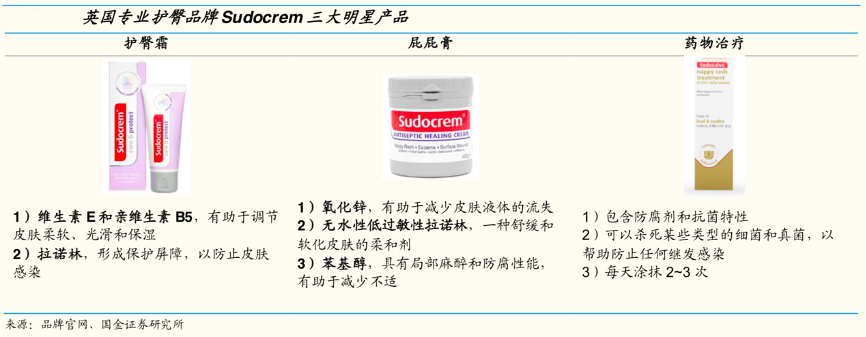 經(jīng)典案例:根據(jù)品牌官網(wǎng)、國金證券研究所等綜合資訊表明,Sudocrem為英國專業(yè)護(hù)臀品牌,其品牌創(chuàng)立于1931 年、具有 90 多年的歷史,品牌三大明星產(chǎn)品——預(yù)防尿布疹的護(hù)臀霜、治療/緩解尿布疹的屁屁膏、針對更加嚴(yán)重已潰破或發(fā)炎的藥膏。其憑借三大產(chǎn)品實(shí)現(xiàn) 20 年在英國嬰童日化行業(yè)約 1.2 億元人民幣、市占率4.6%。
