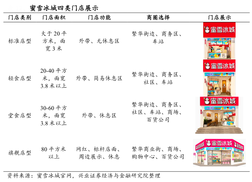 經(jīng)典案例:根據(jù)蜜雪冰城官網(wǎng)、興業(yè)證券經(jīng)濟(jì)與金融研究院等綜合資訊表明,蜜雪冰城推出四種店型,包括標(biāo)準(zhǔn)店型、輕食店型、堂食店型及旗艦店型,門店面積從 20 平方米以上到 80 平方米以上,功能從外帶、無休息區(qū)到網(wǎng)紅標(biāo)桿店、周邊展示,選址覆蓋街邊、商務(wù)區(qū)、車站、社區(qū)、商場、百貨公司和購物中心,基本覆蓋多數(shù)的用戶消費(fèi)場景。