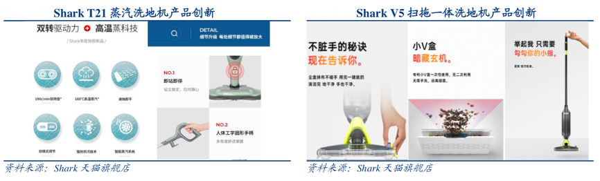 經(jīng)典案例:根據(jù)Shark天貓旗艦店、華創(chuàng)證券等綜合資訊表明,2021年Shark協(xié)同九陽(yáng)研發(fā)針對(duì)國(guó)內(nèi)家庭拖地剛需推出 2 款洗地機(jī)新品:T21 蒸汽洗地機(jī)和 V5 吸拖一體洗地機(jī)。在聚焦國(guó)內(nèi)本土用戶需求的同時(shí)繼續(xù)發(fā)揮 Shark 以用戶為中心的產(chǎn)品創(chuàng)新能力,T21具備實(shí)時(shí)調(diào)整蒸汽出量的智能蒸汽系統(tǒng)及按需切換的雙清潔模式;V5具備如“一鍵即拋”不臟手、機(jī)身輕巧單個(gè)手指即可提起、專利集塵小V盒提升清潔能力等產(chǎn)品創(chuàng)新。