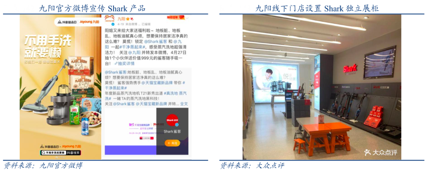 經(jīng)典案例:根據(jù)九陽(yáng)官方微博、大眾點(diǎn)評(píng)、華創(chuàng)證券等綜合資訊表明,Shark 國(guó)內(nèi)渠道宣傳主要依托于九陽(yáng)渠道基礎(chǔ),線上利用九陽(yáng)官方微博等平臺(tái)流量宣傳產(chǎn)品,線下 Shark 已經(jīng)擁有獨(dú)立品牌門(mén)店 200 余家,定位高端Shopping Mall 及 KA 門(mén)店,2019年上半年開(kāi)始利用九陽(yáng)頭部門(mén)店設(shè)置 Shark 獨(dú)立展柜提高終端曝光度。