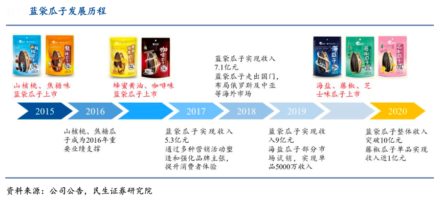 經(jīng)典案例:根據(jù)公司公告、民生證券研究院等綜合資訊表明,洽洽以風(fēng)味化創(chuàng)新為突破口,2015年上市山核桃、焦糖口味藍(lán)袋瓜子,2016年補充更新蜂蜜黃油味、咖啡味瓜子,2019年拓展藤椒、海鹽、芝士 口味,形成系列化風(fēng)味瓜子產(chǎn)品矩陣。2016年藍(lán)袋瓜子上新即為洽洽帶來明確業(yè)績增量,2020年藍(lán)袋瓜子整體營收突破 10 億元,成為紅袋瓜子外第二大品類。