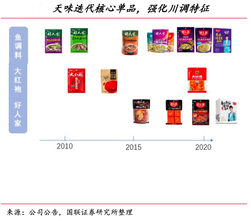 經(jīng)典案例:根據(jù)公司公告、國(guó)聯(lián)證券研究所等綜合資訊表明,天味主要圍繞多款核心大單品進(jìn)行升級(jí)迭代,不斷強(qiáng)化產(chǎn)品力,同時(shí)也在不斷強(qiáng)化公司川味復(fù)調(diào)料的品牌特性。其中,其大單品魚調(diào)料自 2009 年起在 12 年間 經(jīng)歷近 7 次口味或包裝迭代,兩大子品牌的火鍋底料也各自進(jìn)行了 3-4 次產(chǎn)品更新。