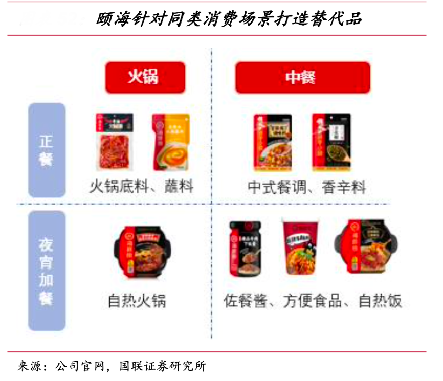 經(jīng)典案例:根據(jù)公司官網(wǎng)、國(guó)聯(lián)證券研究所等綜合資訊表明,頤海在產(chǎn)品開發(fā)上更為注重同類消費(fèi)需求下不同場(chǎng)景的產(chǎn)品挖掘,擴(kuò)展?jié)摿Ω鼜?qiáng)。復(fù)合調(diào)味品消費(fèi)者主要是對(duì)口味有追求、烹飪能力和時(shí)間相對(duì)有限的年輕群體,因此頤海在品類擴(kuò)容上選中方便食品作為第二核心,同樣針對(duì)此類群體在較為常見的夜宵、加班、加餐等場(chǎng)景下的消費(fèi)需求打造了沖泡、休閑食品。