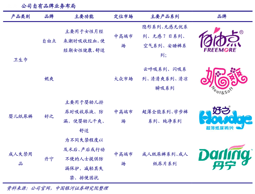 經(jīng)典案例:根據(jù)公司官網(wǎng)、中國(guó)銀河證券研究所等綜合資訊表明,百亞股份公司擁有的自有品牌產(chǎn)品包括衛(wèi)生巾、嬰兒紙尿褲、成人失禁用品,涵蓋中高端市場(chǎng)和大眾市場(chǎng)。“自由點(diǎn)”、“妮爽”衛(wèi)生巾,分別定位于中高端市場(chǎng)和大眾市場(chǎng),“自由點(diǎn)”品牌理 念為青春自由,包含有多個(gè)系列的產(chǎn)品,分別針對(duì)女性不同需求的場(chǎng)景,是公司目前的拳頭產(chǎn)品。“妮爽”產(chǎn)品定位大眾市場(chǎng),價(jià)格優(yōu)惠,滿足大眾女性的生理期需求。