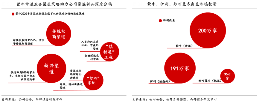 經(jīng)典案例:根據(jù)公司公告、公開資料、西部證券研發(fā)中心等綜合資訊表明,妙可藍(lán)多所屬的公司常溫奶酪棒打破冷鏈運(yùn)輸,預(yù)計(jì)憑借百萬量級(jí)常溫終端帶來可期純?cè)隽俊=Y(jié)合市場(chǎng)資訊表明,蒙牛集團(tuán)常溫事業(yè)部銷售管理中心總經(jīng)理閆志遠(yuǎn)表示,蒙牛分銷網(wǎng)點(diǎn)達(dá)到 200 萬家左右?,F(xiàn)今,蒙牛常溫業(yè)務(wù)實(shí)行線上線下深度分銷,搭建“村鎮(zhèn)通”系統(tǒng)全面深挖農(nóng)村市場(chǎng)。