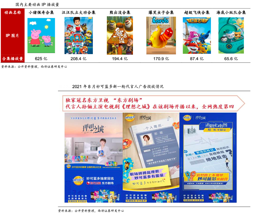 經(jīng)典案例:根據(jù)公開資料、西部證券研發(fā)中心等綜合資訊表明,妙可藍(lán)多精準(zhǔn)選擇熱門動(dòng)畫 IP+形象代言:“汪汪隊(duì)+皮卡丘”動(dòng)畫 IP 定位兒童端,“寶媽孫儷”形象代言定位家長端。2018 年,妙可藍(lán)多簽約動(dòng)畫 IP“汪汪隊(duì)立大功”,推出初代奶酪棒。國內(nèi)主要?jiǎng)赢媮砜?,汪汪?duì)合集播放量已超 200 億,僅次于小豬佩奇,超越熊出沒,位居第二,在兒童圈的熱度不言而喻。2020 年,公司與寶可夢(mèng) IP(皮卡丘)聯(lián)名,推出干酪 含量超過 40%的金裝奶酪棒,產(chǎn)品品質(zhì)+包裝進(jìn)一步升級(jí)。2021 年 8 月,孫儷主演電視劇《理想之城》在東方衛(wèi)視熱播,全網(wǎng)熱度第四,妙可 藍(lán)多獨(dú)家冠名東方衛(wèi)視“東方劇場(chǎng)”,借助影視熱度持續(xù)升級(jí)品牌形象,深化消費(fèi)者認(rèn)知。