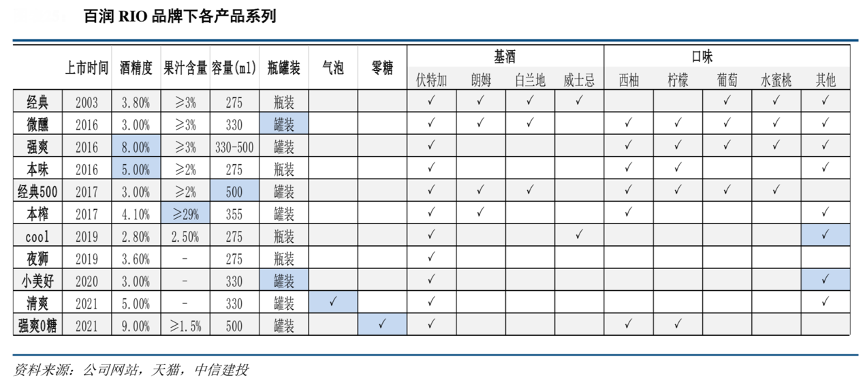 經(jīng)典案例:根據(jù)公司網(wǎng)站、天貓、中信建投等綜合資訊表明,百潤公司通過酒精度數(shù)、瓶罐裝設(shè)計(jì)、容量、果汁含量劃分產(chǎn)品系列,再通過果汁種類、 基酒原料等,豐富各個(gè)產(chǎn)品系列。目前 RIO 品牌的產(chǎn)品系列覆蓋2.8%-9%酒精度數(shù)、瓶灌裝包裝、2%-29%果汁含量、275-500ml容量、有無氣泡、是否零糖、多種基酒、多種口味,有助于實(shí)現(xiàn)公司在預(yù)調(diào)雞尾酒行業(yè)的全方位布局。2020 年 8.18-11.29 期間,美好生活系列的 GMV 總計(jì)2427 萬,平臺曬單率高達(dá) 80%。