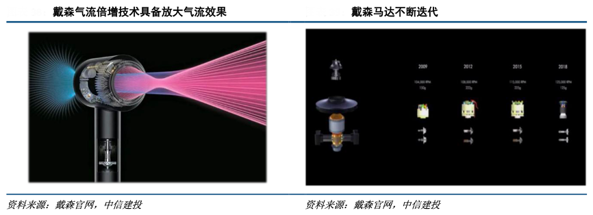 經(jīng)典案例:根據(jù)戴森官網(wǎng)、中信建投等綜合資訊表明,戴森通過改進空氣動力形態(tài),形成“康達效應”達到更大風量的目的,使得吹出的風速相較于實際流速增大了 16 倍左右,使其在外形設計、風力制造和能量節(jié)約方面卓然領(lǐng)先于市場,定價于3000+元的市場,并獲得了消費者的認可。同時,其投入 3.5 億英鎊用于馬達的 研究,在進一步提升吸力的同時,直接促成了產(chǎn)品形態(tài)向無繩化轉(zhuǎn)變。