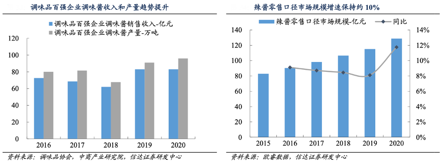 經(jīng)典案例:根據(jù)歐睿數(shù)據(jù)、調(diào)味品協(xié)會(huì)、中商產(chǎn)業(yè)研究院和信達(dá)證券研發(fā)中心等綜合資訊表明,2020年調(diào)味品頭部企業(yè)收入占比 31%;產(chǎn)量合計(jì) 96 萬(wàn)噸,頭部企業(yè)產(chǎn)量占比 30%。辣醬是調(diào)味醬重要的品類(lèi),根據(jù)歐睿數(shù)據(jù),2020 年辣醬零售口徑市場(chǎng)規(guī)模為 128.7 億元,15-20 年市場(chǎng)規(guī)模復(fù)合增速為 9.2%。海天主打黃豆醬,利用渠道優(yōu)勢(shì)迅速打開(kāi) 市場(chǎng)銷(xiāo)路,海天黃豆醬已成為銷(xiāo)售額超過(guò) 10 億元的大單品。