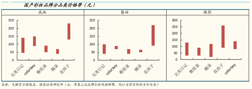 經(jīng)典案例:根據(jù)天貓官方旗艦店、國(guó)金證券研究所等綜合資訊表明,花西子覆蓋中高端-高端;color key、橘朵等定位中低端,單一品類價(jià)格帶窄。眼妝、底妝品類也有同樣的趨勢(shì)。完美日記利用大量 SKU 鋪設(shè)更廣價(jià)格帶的產(chǎn)品矩陣拓寬受眾,為消費(fèi)者提供多層次選擇有利于加速綁定。
