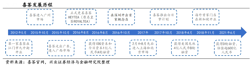 經(jīng)典案例:根據(jù)喜茶官網(wǎng)、興業(yè)證券經(jīng)濟與金融研究院等綜合資訊表明,喜茶是新式茶飲的開創(chuàng)者,其產(chǎn)品創(chuàng)新性地使用了原葉茶基底并搭配上芝士奶蓋,受到消費者的廣泛好評。2012 年 5 月,第一家 喜茶在江門市開業(yè)。2018 年,喜茶在新加坡開出首家海外門店。2020 年 6 月,喜茶獲得 D 輪融資,估值超過 600 億人民幣。喜茶集聚中國文化傳統(tǒng)與創(chuàng)意創(chuàng)新于一體,專注于呈現(xiàn)優(yōu)質(zhì)茶香,開啟了新式茶飲風(fēng)潮。
