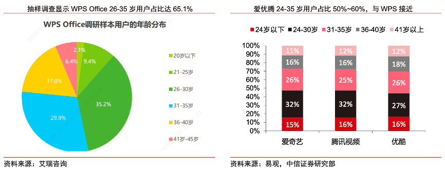 經(jīng)典案例:根據(jù)艾瑞咨詢、易觀、中信證券研究部等綜合資訊表明,愛(ài)奇藝、優(yōu)酷、騰訊視頻”等網(wǎng)絡(luò)視頻應(yīng)用與 WPS 均為跨終端應(yīng)用;均主要通過(guò)小額支付方式付費(fèi),年訂閱費(fèi)用在 200 元上下,與 WPS 超級(jí)會(huì)員 179 元年費(fèi)價(jià)格接近;易觀數(shù)據(jù)顯示,“愛(ài)優(yōu)騰”24-35歲用戶占比在 50%~60%之間,與 WPS 26-35 歲用戶 65%的用戶年齡結(jié)構(gòu)相似。