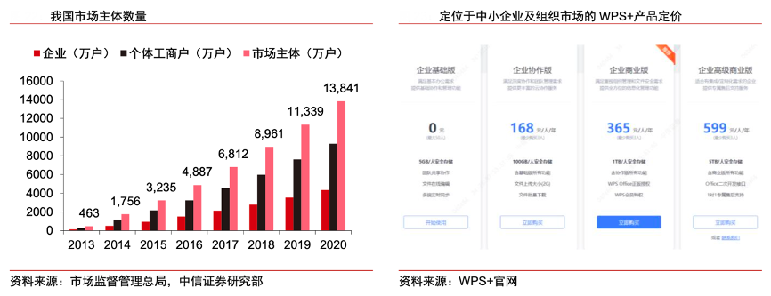 經(jīng)典案例:根據(jù)市場(chǎng)監(jiān)督管理總局、WPS+官網(wǎng)、中信證券研究部等綜合資訊表明,截至 2020 年我國(guó)市場(chǎng)主體數(shù)量近 1.4 億戶,其中企業(yè)數(shù)量 超過(guò)4300萬(wàn)戶,且絕大多數(shù)是中小企業(yè)。WPS+定位于中小企業(yè)及組織市場(chǎng), 中信證券研究部以該產(chǎn)品三檔定價(jià) 168、365、599 元/人/年為參考,假設(shè)每家企業(yè)購(gòu)買最低限度人次的產(chǎn)品(3人)、中小企業(yè)數(shù)量 3900 萬(wàn)戶(企業(yè)總數(shù)的 90%),參照海外 Office 365 推廣情況,中信證券研究部估算每年中小企業(yè)市場(chǎng)空間(按三檔產(chǎn)品定價(jià)保守/中性/樂(lè)觀逐步滲透)有望分別達(dá)到 197 億元、427 億元、701 億元。