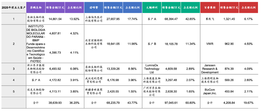 經(jīng)典案例:根據(jù)wind、公司公告和國(guó)聯(lián)證券研究所等綜合資訊表明,菲鵬生物、諾唯贊、義翹神州和百普賽斯前五大客戶占比分別為36.20%、43.77%、60.80%和19.67%,其中義翹神州的大客戶占比較高,最大客戶貢獻(xiàn)營(yíng)收占比達(dá)到了42.85%。從客戶結(jié)構(gòu)看,菲鵬和諾唯贊的工業(yè)客戶占比較高,百普賽斯客戶則是以科學(xué)服務(wù)商和醫(yī)藥公司的研發(fā)部門為主。
