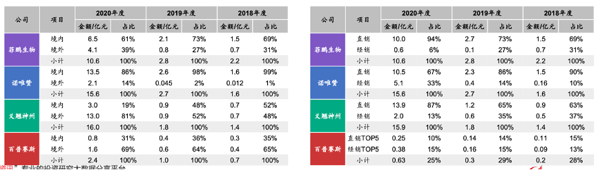 經(jīng)典案例:根據(jù)wind、公司公告和國(guó)聯(lián)證券研究所等綜合資訊表明,菲鵬生物得益于對(duì)海外客戶的培養(yǎng),一是打入歐美發(fā)達(dá)國(guó)家的IVD供應(yīng)鏈體系,二是通過(guò)向第三世界國(guó)家輸出技術(shù)平臺(tái)+后續(xù)產(chǎn)品的模式,其直銷渠道占比從69%上升至94%,境外收入占比從31%上升至39%。