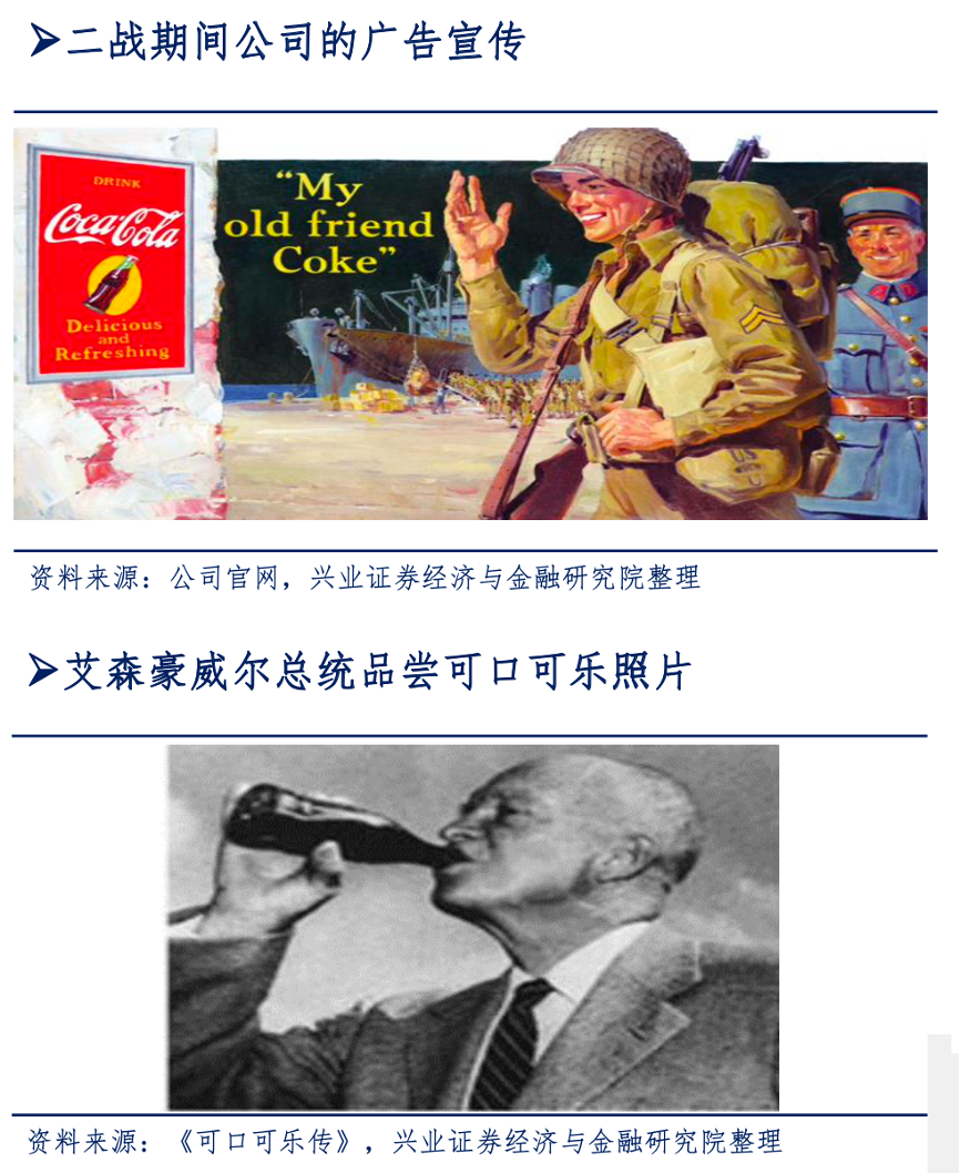 經(jīng)典案例:根據(jù)公司官網(wǎng)、《可口可樂傳》、興業(yè)證券經(jīng)濟(jì)與金融研究院等綜合資訊表明,可口可樂在戰(zhàn)時(shí)積極宣傳營銷其對美軍作戰(zhàn)做出的貢獻(xiàn),樹立了深入人心的愛國形象,這正迎合了戰(zhàn)爭時(shí)期民眾高漲的愛國熱情,使得可口可樂 進(jìn)一步成為了美國人心中的“國民飲料”。其為了凸顯產(chǎn)品的“美國”概念,常常邀請美國政府官員,尤其是各位總統(tǒng)品嘗可口可樂,并將照片加以宣傳,這更是使得可口可樂成為美國二戰(zhàn)后的一張閃亮的“名片”。