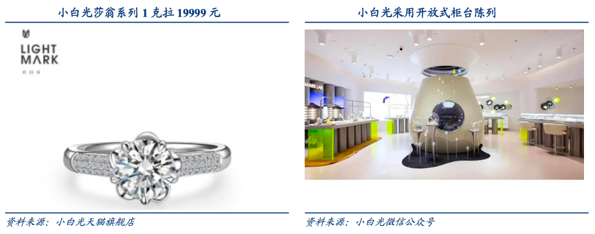經(jīng)典案例:根據(jù)小白光天貓旗艦店、小白光微信公眾號(hào)、華創(chuàng)證券等綜合資訊表明, 2020年小白光正式推出,2021 年 1 月其在上海開(kāi)設(shè)首家線下門店,小白光提供以 HPHT 法生產(chǎn)的培育鉆石,推出終端售價(jià)為 19999 元的 1 克拉鉆戒的主打產(chǎn)品,希望基于材料創(chuàng)新、 提供高性價(jià)比、更環(huán)保的鉆石產(chǎn)品,實(shí)現(xiàn)年輕人可負(fù)擔(dān)的奢侈,打造屬于 Z 時(shí)代的“克拉自由”。
