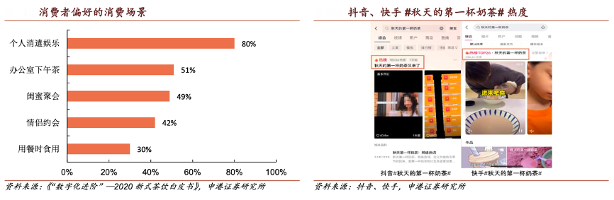 經(jīng)典案例:根據(jù)《“數(shù)字化進(jìn)階”—2020新式茶飲白皮書(shū)》、抖音、快手、申港證券研究所等綜合資訊表明,結(jié)合CBNData 調(diào)查,新式茶飲的消費(fèi)場(chǎng)景不 斷延伸,逐漸成為一種生活方式。2021年8月7日的抖音#秋天的第一杯奶茶又 來(lái)了#熱度達(dá) 183.6 萬(wàn)條,快手#秋天的第一杯奶茶#熱度達(dá) 582.3 萬(wàn)條。除了茶飲越來(lái)越成為生活所需品,烘焙類(lèi)產(chǎn)品也成為人們饑餓時(shí)的選擇。根據(jù)CBNData調(diào)查,53%的消費(fèi)者表示,在享用新式茶飲時(shí)偏好搭配烘焙類(lèi)產(chǎn)品。