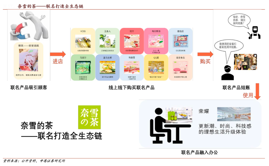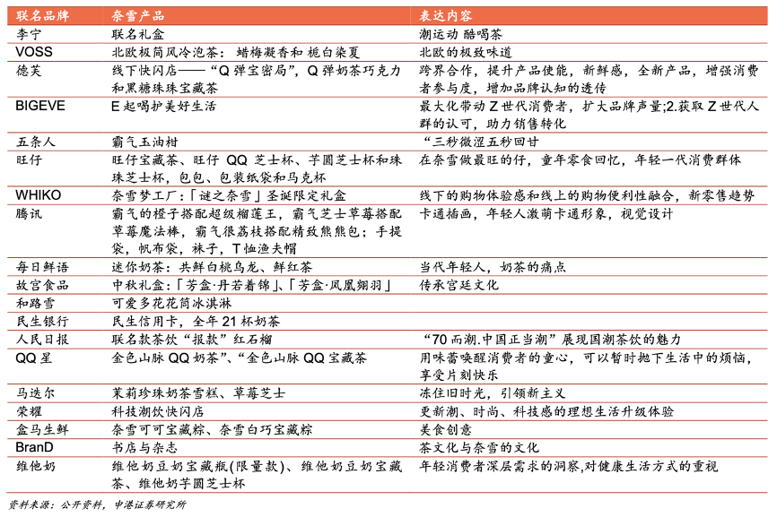 經(jīng)典案例:根據(jù)公開資料、申港證券研究所等綜合資訊表明,奈雪產(chǎn)品與李寧、五條人等展開多種“聯(lián)合合作”,品牌影響力持續(xù)擴大。