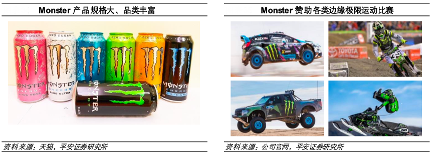 經(jīng)典案例:根據(jù)天貓、公司官網(wǎng)、平安證券研究所等綜合資訊表明,Monster 憑借差異化競爭策略實(shí)現(xiàn)后發(fā)制勝。其圍繞年輕消費(fèi)群體精準(zhǔn)營銷。Monster 主要贊助邊緣極限運(yùn)動(dòng)如越野摩托車賽、一級(jí)方程式賽車、格斗等賽事,成本相對(duì)較低,并且相對(duì)傳統(tǒng)運(yùn)動(dòng)項(xiàng)目更能向消費(fèi)者傳遞出年輕、狂野不羈的個(gè)性態(tài)度,與紅牛重視內(nèi)容輸出,其偏好贊助頂級(jí)賽事和親自策劃如街舞比賽、帆船比賽等營銷方式形成區(qū)別,同時(shí) Monster 也尤其注重地推,實(shí)現(xiàn)精準(zhǔn)營銷。