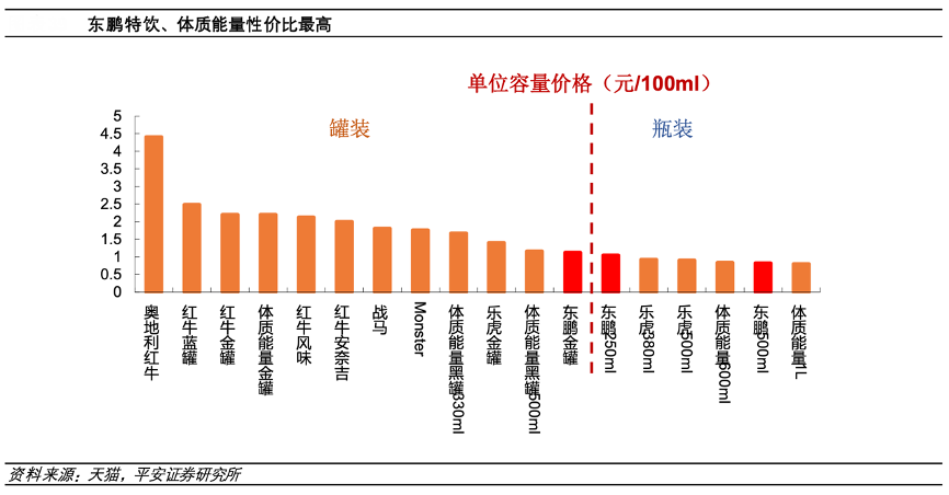 經(jīng)典案例:根據(jù)天貓、平安證券研究所等綜合資訊表明,東鵬特飲、體質(zhì)能量性價(jià)比和便攜性較好。1)性價(jià)比方面:目前國內(nèi) 4 款紅牛產(chǎn)品鎖定行業(yè)定價(jià)天花板,250ml 金罐終端價(jià)在 5-6 元,奧地利紅牛250ml 藍(lán)罐定價(jià)高達(dá) 11 元。第二梯隊(duì)中,戰(zhàn)馬、Monster 定價(jià)對(duì)標(biāo)紅牛,東鵬特飲和體質(zhì)能量性價(jià)比較高,其中東鵬產(chǎn)品全面涵蓋 2-5 元價(jià)格帶。2)包裝規(guī)格方面:配合高性價(jià)比策略,東鵬、體質(zhì)能量和樂虎等品牌均推出大規(guī)格 PET瓶裝,提升消費(fèi)者便攜性的同時(shí)降低成本,并且東鵬還擁有防塵蓋專利設(shè)計(jì),增強(qiáng)衛(wèi)生屬性及外觀辨識(shí)度;而紅牛包裝規(guī)格僅有 250ml 金罐和藍(lán)罐。