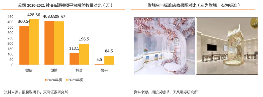 經(jīng)典案例:根據(jù)招股說明書、天風(fēng)證券研究所等綜合資訊表明,2021 年初,DR 在微信、微博、抖音、快手粉絲分別達(dá) 428.56 萬人、405.57 萬人、196.5 萬人、84.5 萬人,分別同比變動(dòng)18.87%、-0.76%、77.83%、1436.36%,其中短視頻平臺(tái)的粉絲增速尤為迅猛。在短視頻超越即時(shí)通訊類 APP 成為移動(dòng)互聯(lián)網(wǎng)第一流量入口與 DR 在短視頻類別上大幅增加推廣費(fèi)用的雙層助力下,DR品牌得到了顯著的推廣效果,形成良好品牌傳播效果。