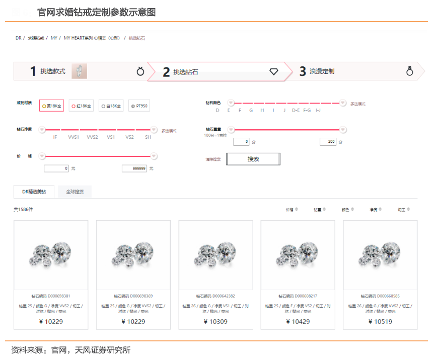 經(jīng)典案例:根據(jù)官網(wǎng)、天風(fēng)證券研究所等綜合資訊表明,對(duì)于求婚鉆戒、結(jié)婚對(duì)戒產(chǎn)品,消費(fèi)者在現(xiàn)有產(chǎn)品系列中選擇商品款式后,根據(jù)自身需求確定鉆石參數(shù)、戒托材質(zhì)、手寸大小及個(gè)性化刻字需求等定制內(nèi)容,定制周期一般不超過 30 天,增強(qiáng)產(chǎn)品的唯一性和獨(dú)特性。迪阿股份公司借助該模式以及供應(yīng)鏈的高效運(yùn)作實(shí)現(xiàn)“以需定產(chǎn)”,快速捕捉消費(fèi)者喜好及流行趨勢(shì)的變動(dòng),保持較低存貨水平、較低的開店成本及良好的現(xiàn)金流。