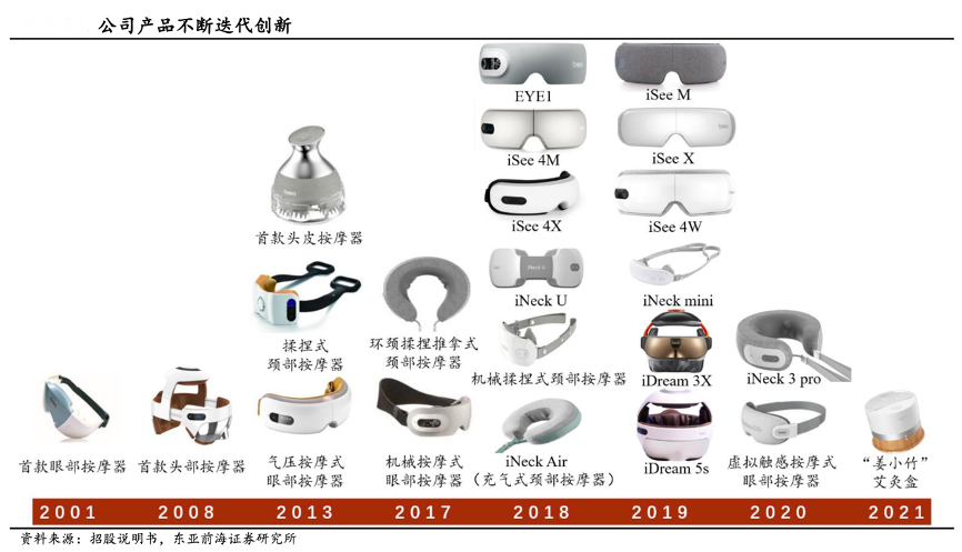 經(jīng)典案例:根據(jù)天貓旗艦店、東亞前海證券研究所等綜合資訊表明,目前倍輕松公司主要產(chǎn)品覆蓋 眼部、頸部、頭部、頭皮等主流部位,其他部位也有產(chǎn)品銷售,2021年其還新推出了智能艾灸盒產(chǎn)品“姜小竹 A1”,產(chǎn)品布局進(jìn)一步延伸至中醫(yī)個護(hù)。每一個核心品類均有多個 SKU,滿足消費者多元化消費需求。如眼部按摩器有氣壓按摩式、機(jī)械按摩式和虛擬觸感按摩式三種類型等。