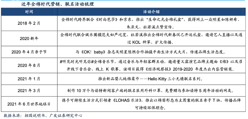 經(jīng)典案例:根據(jù)招股說明書、廣發(fā)證券研究中心等綜合資訊表明,首先2020年全棉時(shí)代加盟店試點(diǎn)成功,可以根據(jù)不同產(chǎn)品的需求進(jìn)行差異化營銷,減少不必要的營銷開支,進(jìn)一步提升其經(jīng)營能力。其次,迎合新時(shí)代年輕人群體、90后父母的消費(fèi)習(xí)慣,通過推出跨界聯(lián)名的方式觸達(dá)不同消費(fèi)偏好的客戶群體,進(jìn)行IP化運(yùn)營增加產(chǎn)品的亮點(diǎn)、滿足消費(fèi)者的情緒價(jià)值和心理需求,同時(shí)豐富品牌內(nèi)涵,融入時(shí)尚和新潮元素,環(huán)保和時(shí)尚堅(jiān)固的品牌形象打造差異化,加深在消費(fèi)者心中的印象。