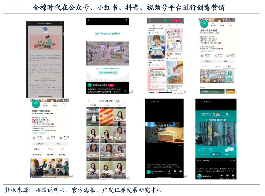 經(jīng)典案例:根據(jù)招股說明書、官方海報(bào)、廣發(fā)證券發(fā)展研究中心等綜合資訊表明,全棉時(shí)代重視借助私域流量的引導(dǎo)和維護(hù)提高客戶粘性和復(fù)購率,通過其強(qiáng)大的私域流量池積極地進(jìn)行消費(fèi)者教育,在其依托于微信的私域流量平臺(tái)上(包括微信公眾號(hào)、小程序和視頻號(hào)、小紅書、抖音等)通過圖文互動(dòng)、科普視頻、微電影、趣味短視頻等豐富的內(nèi)容形式傳播全棉材質(zhì)的優(yōu)勢和使用場景,用“棉粉”稱呼消費(fèi)者,不斷深化與消費(fèi)者的互動(dòng)和情感連接,在各類消費(fèi)品隨處可買的互聯(lián)網(wǎng)平臺(tái)打造記憶點(diǎn)。