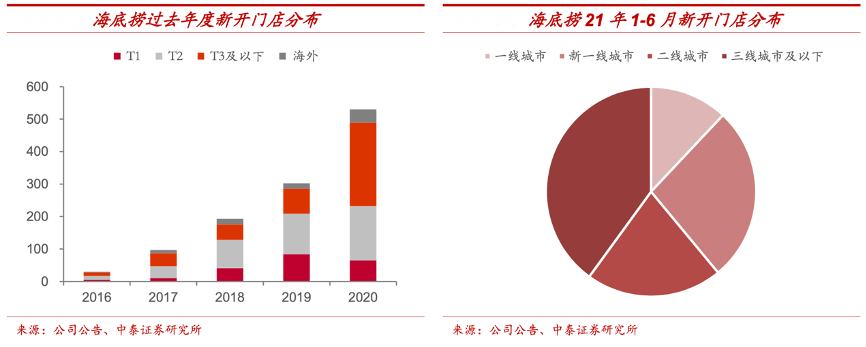 經(jīng)典案例:根據(jù)公司公告、中泰證券研究所等綜合資訊表明,2020年之前,三 線城市海底撈門店只有不到 200 家。近年來(lái),海底撈開(kāi)始發(fā)力下沉市場(chǎng),2021H1,海底撈在一、二、三線城市新開(kāi)的門店數(shù)量分別為 75 家、204 家和 344 家,在三線新開(kāi)的門店數(shù)量超過(guò)在一、二線城市新開(kāi)門店數(shù)量的總和。門店下沉可以有效控制門店租金、人工壓力,與此同時(shí),發(fā)力下沉市場(chǎng)也可緩解核心市場(chǎng)開(kāi)店壓力。