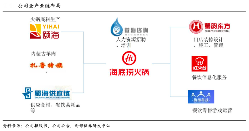 經(jīng)典案例:根據(jù)公司招股書、公司公告、西部證券研發(fā)中心等綜合資訊表明,為了滿足門店的擴(kuò)張需求以及供應(yīng)鏈流程的標(biāo)準(zhǔn)化、可控化,海底撈在內(nèi)部設(shè)立了供應(yīng)鏈管理部門、人力資源招聘及培訓(xùn)部門、新門店裝修及維護(hù)部門以及火鍋底料生產(chǎn)基地,并于2015年前后將過(guò)去服務(wù)于海底撈內(nèi)部的供應(yīng)鏈及開(kāi)店支持部門逐步獨(dú)立出來(lái),分別成立頤海國(guó)際(火鍋底料生產(chǎn)企業(yè),1579.HK)、蜀海集團(tuán)(供應(yīng)鏈服務(wù)企業(yè))、蜀韻東方(門店設(shè)計(jì)裝飾企業(yè))、微海咨詢(人力招聘及培訓(xùn)咨詢)、紅火臺(tái)(與用友成立合資公司,專注于餐飲信息化)以及海??萍?餐飲零售游戲開(kāi)發(fā))等。獨(dú)資或合資公司目前已經(jīng)從“內(nèi)部服務(wù)”走向“外部+內(nèi)部”雙向服務(wù),市場(chǎng)化經(jīng)營(yíng)環(huán)境下服務(wù)、管理能力得到完善和升級(jí)。
