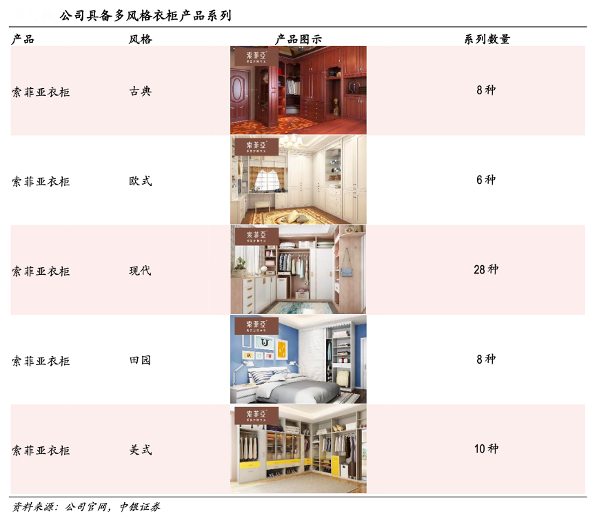 經(jīng)典案例:根據(jù)公司官網(wǎng)、中銀證券等綜合資訊表明,索菲亞公司深耕衣柜業(yè)務(wù)多年,并在行業(yè)內(nèi)首創(chuàng)定制衣柜概念,將定制的個(gè)性化和成品衣柜的規(guī)?;瘍?yōu)勢(shì)相結(jié)合。其衣柜風(fēng)格結(jié)合了浪漫經(jīng)典的歐洲藝術(shù)和中國現(xiàn)代生活藝術(shù),引領(lǐng)了時(shí)尚潮流,并推出雙飾面、烤漆、實(shí)木等不同材質(zhì)的衣柜產(chǎn)品覆蓋不同消費(fèi)能力的消費(fèi)者。2020年其衣柜業(yè)務(wù)收入為 67.0 億元,近 5 年復(fù)合增長率為 16.9%,衣柜收入規(guī)模位于行業(yè)第一。