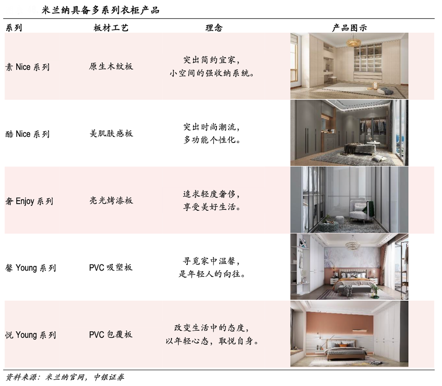 經(jīng)典案例:根據(jù)米蘭納官網(wǎng)、中銀證券等綜合資訊表明,由于索菲亞衣柜定位中高端市場,較難覆蓋到大量大眾消費(fèi)群體。2021 年 3 月,其公司正式發(fā)布性價(jià)比品牌米蘭納以開拓增量市場,米蘭納產(chǎn)品工藝以平板和吸塑為主,與索菲亞產(chǎn)品特點(diǎn)形成較大差異,并有望依托索菲亞強(qiáng)大品牌力與供應(yīng)鏈迅速拓展 低價(jià)格段市場。截至2021 年 H1,米蘭納已發(fā)展經(jīng)銷商 214 家,專賣店 32 家。