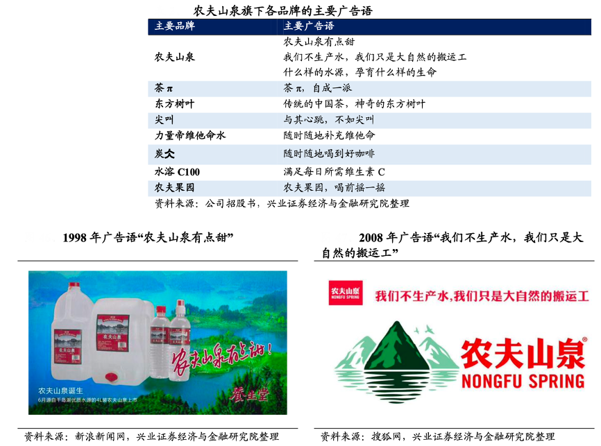 經(jīng)典案例:根據(jù)公司招股書、新浪新聞網(wǎng)、搜狐網(wǎng)、興業(yè)證券經(jīng)濟與金融研究院等綜合資訊表明,農(nóng)夫山泉通過定位“健康的水”,切入天然水賽道,打破固有的行業(yè)格局。2011年起,農(nóng)夫山泉擠入TOP3;2016年以后,農(nóng)夫山泉市占率連年攀升,并搶占行業(yè)老二及老三的市場份額。2020年農(nóng)夫山泉市占率為 12.5%,CR3 為 26.9%,領(lǐng)跑行業(yè)。20多年來,其具有生命力的廣告語響遍大江南北,將農(nóng)夫山泉品牌升華到新高度,既迎合了消費者對于水源純凈天然的向往與愿景,又塑造了產(chǎn)品健康、自然、好喝的特點。